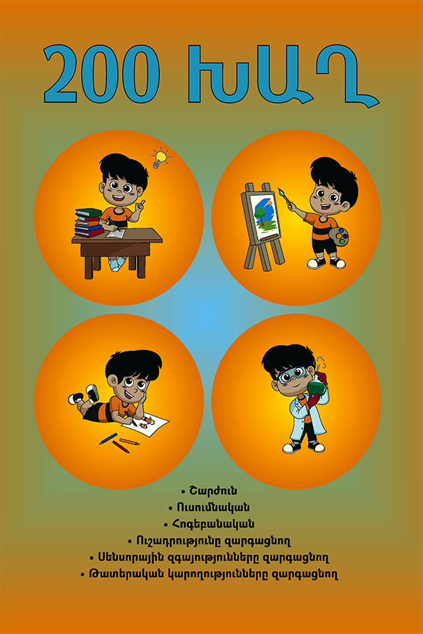 «200 խաղ» ձեռնարկը կազմված է երկու բաժնից: Առաջին բաժինը պարունակում է 5 խումբ խաղեր` շարժուն, ուշադրությունը, սենսորային զգայությունները, թատերական կարողությունները զարգացնող և հոգեբանական:
