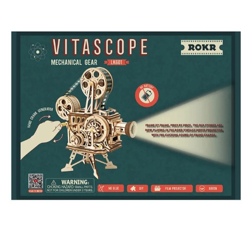 Robotime-ROKR DIY vintage movie projector Vitascope LK601 can play movies for real! Classic design with hand crank generator, this premium-design 3D wooden puzzle will satisfy movie lovers both in crafting and playing. Put the mechanism together piece by piece, and put on the black & white film. Enjoy a cinema together with friends and family!