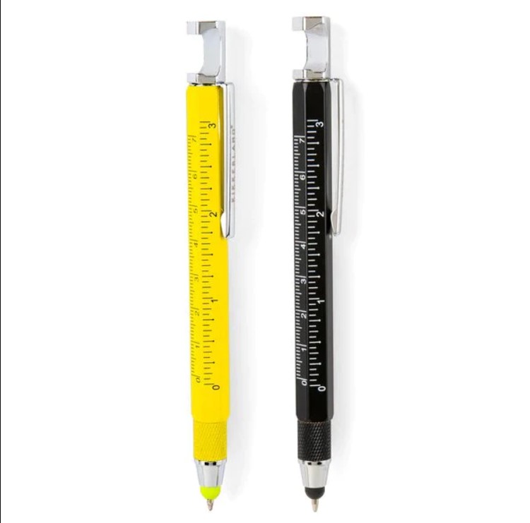 The ultimate multi pen. For the mulltitaskers with a lot to do and limited cargo, this tech tool pen comes with 7 very handy functions: a bottle opener, a phone stand, a ruler, a ballpoint pen, a stylus, a mini flat-head and a Phillips screwdriver. Refillable, Metal D1 refill. Materials: aluminum, copper, steel Packaging: card Dimensions: 14 x 1,1 cm