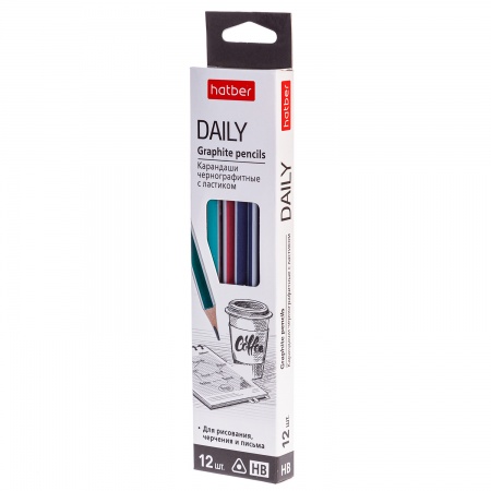 Чернографитный карандаш для черчения, рисования и письма. Трехгранный корпус. Хорошо и ровно точится. Прочный грифель диаметром 2 мм и твердостью HB. С ластиком. Заводская заточка. Упаковка: индивидуальная картонная коробка с европодвесом 12 штук.