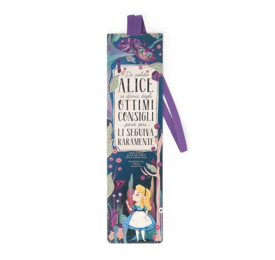 This Legami bookmark features a quote from Alice in Wonderland in Italian and a whimsical illustration. The elastic page marker can be hooked over the cover to keep your book closed and protected. The paper is FSC® certified (FSC-C154586), coming from well-managed forests, FSC® certified forests and other controlled sources. Illustration by Flavia Sorrentino