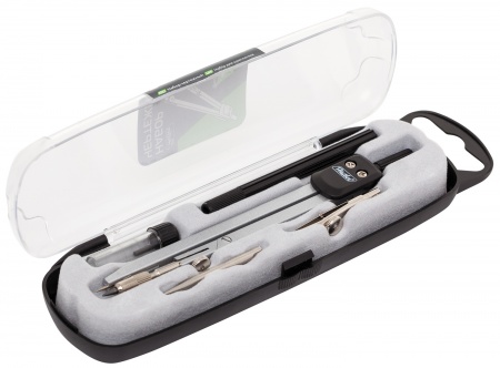 Металлические части чертежного инструмента ТМ Hatber изготовлены из цинка, надежный соединительный механизм позволяет выдерживать многократные циклические нагрузки. Готовальня упакована в пластиковый пенал с прозрачной крышкой, оснащена европодвесом для расположения на специальных стойках с навесными крючками. Предназначена для учеников старших классов и студентов. Наполнение из пяти предметов: циркуль, точечная насадка, рейсфедерная вставка, держатель для нее и пенал с запасным грифелем.