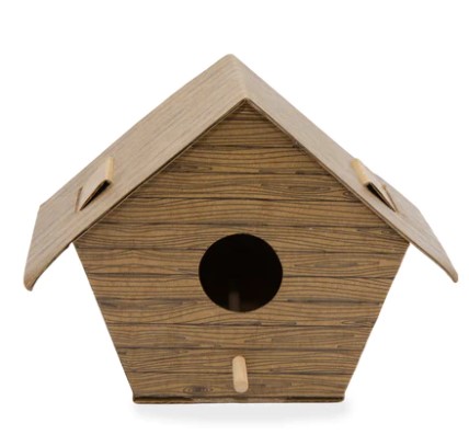 Perfect for bird lovers! Easy to put together. No tools necessary, other than your hands! Water-resistant house with a dowel for the front perch Designer: KDT Product Measurement: (Assembled) 18,4 x 14 x 10,8 cm Material: wax coated cardboard, wood dowel