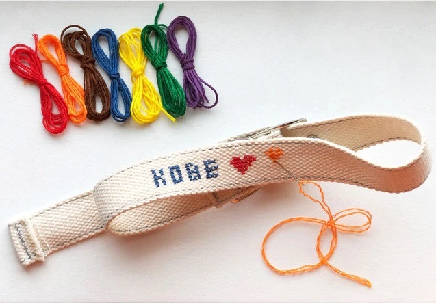 Personalize your dog's collar with this DIY cross stitch set. Includes: 2x needles, 7x threads (red, orange, yellow, green, blue, purple & brown), 1x collar. Design: KDT Materials: cotton, nickle plated alloy Packaging: color box Dimensions: 2,5 x 48 cm