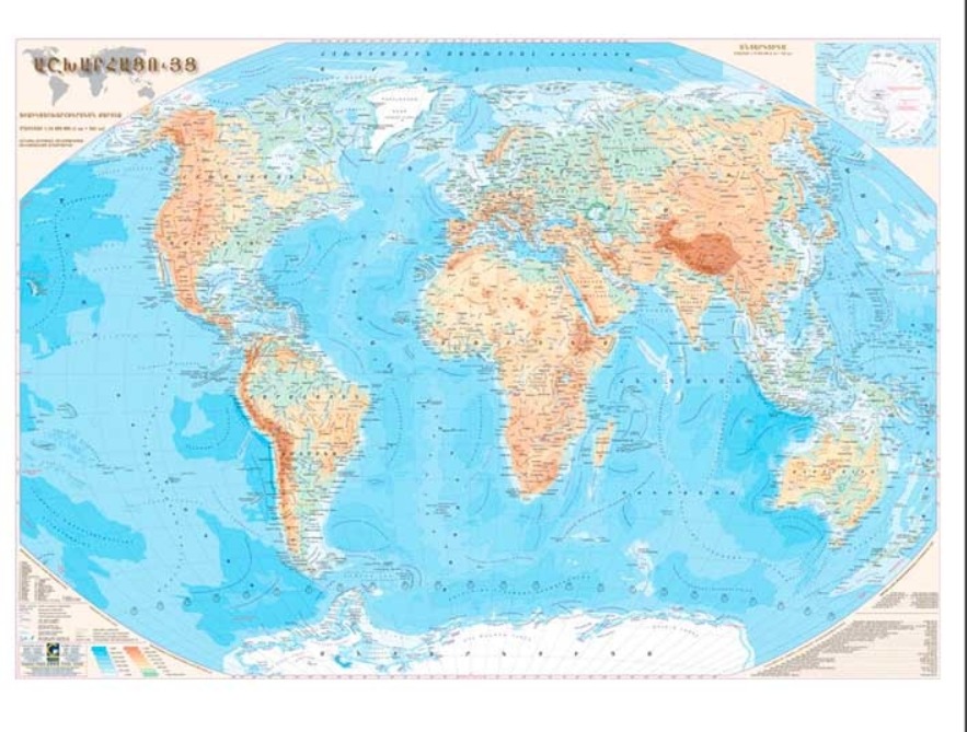 Աշխարհի ֆիզիկական քարտեզում առաջին անգամ հայերենով արտացոլված է աշխարհի ամբողջական ֆիզիկաաշխարհագրական ընդհանուր պատկերը: Ճշտված են և բնագրից հայերեն են թարգմանված բազմաթիվ տեղանուններ: