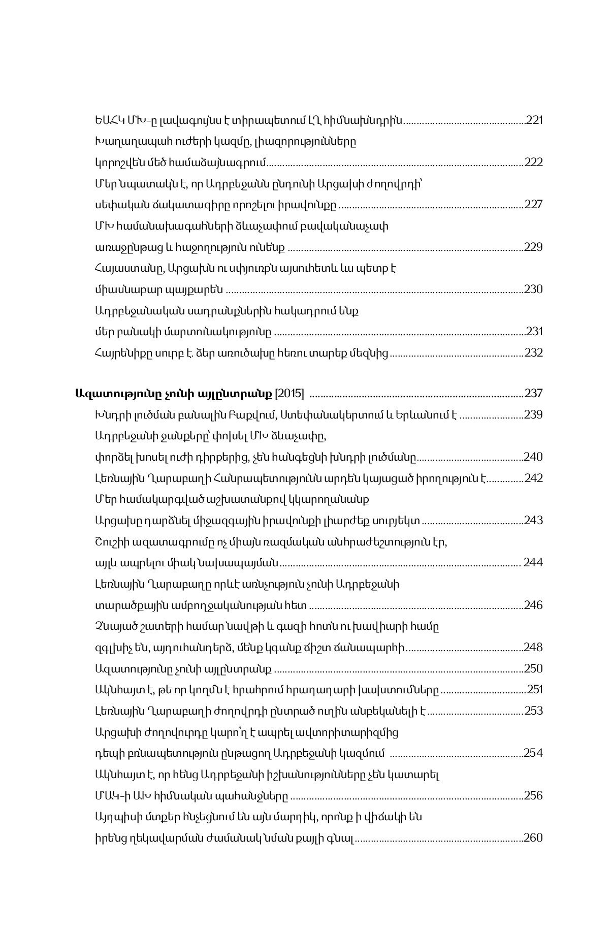 Դրանցում արտահայտված մոտեցումները հստակ ցույց են տալիս վերոնշյալ ժամանակահատվածում հակամարտության կարգավորման հարցում Սերժ Սարգսյանի վարած քաղաքականությունը, բանակցային գործընթացի զարգացումերը, որոշակի փուլերում առաջացած խնդիրները, առաջընթացն ու ձեռքբերումները, ՀՀ երրորդ նախագահի եւ նրա քաղաքական թիմի «կարմիր գծերը» հիմախնդրի կարգավորման գործընթացում: