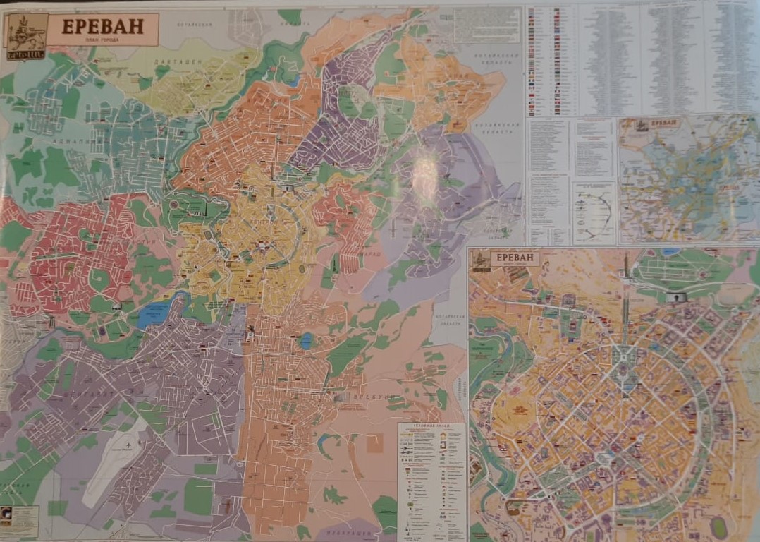 Երևան քաղաքի քարտեզում պատկերված է Հայոց մայրաքաղաքի ուրվագիծ-քարտեզը, ներդիրներում զետեղված են Երևանի կենտրոնն ու քաղաքի ընդհանուր փոքրածավալ քարտեզը ռուսերեն լեզվով: