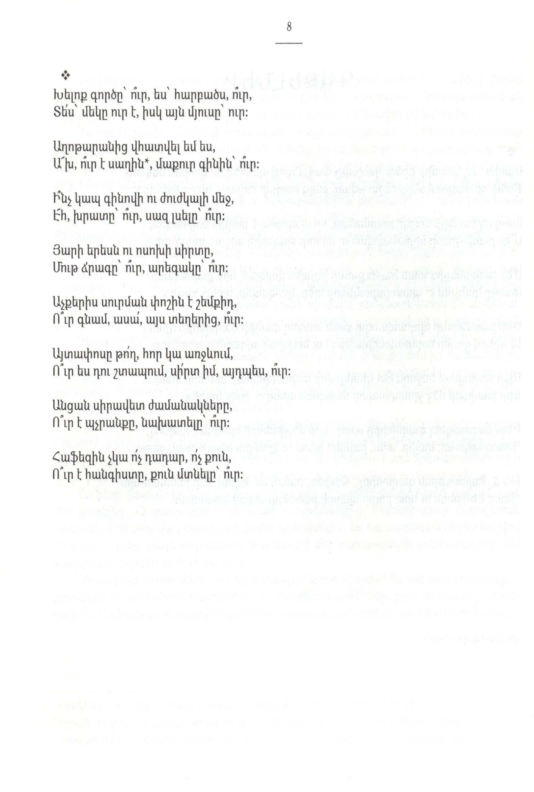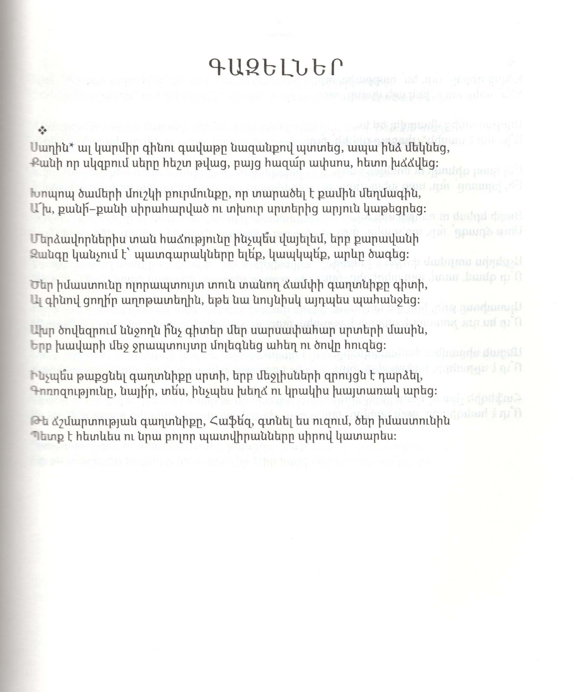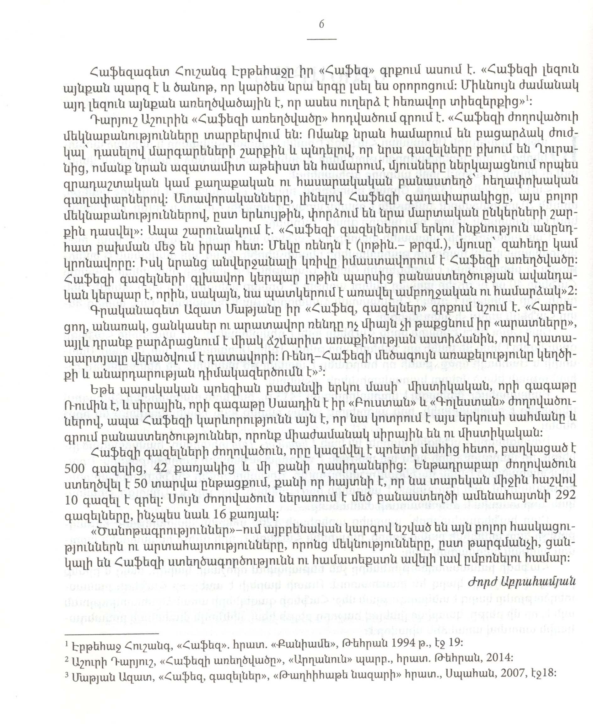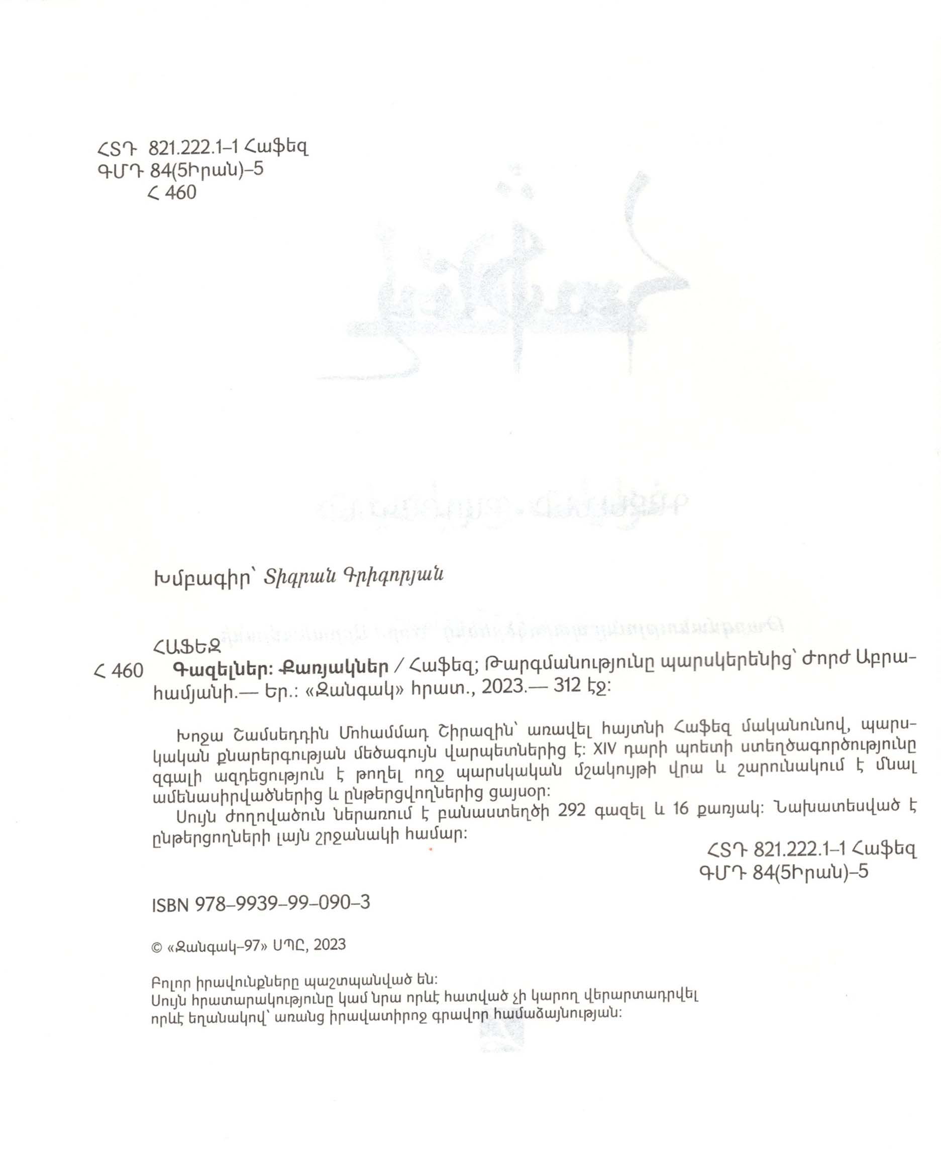 Խոջա Շամսեդդին Մոհամմադ Շիրազին՝ առավել հայտնի Հաֆեզ մականունով, պարսկական քնարերգության մեծագույն վարպետներից է։ XIV դարի պոետի ստեղծագործությունը զգալի ազդեցություն է թողել ողջ պարսկական մշակույթի վրա և շարունակում է մնալ ամենասիրվածներից և ընթերցվողներից ցայսօր։ Սույն ժողովածուն ներառում է բանաստեղծի 292 գազել և 16 քառյակ։ Նախատեսված է ընթերցողների լայն շրջանակի համար։