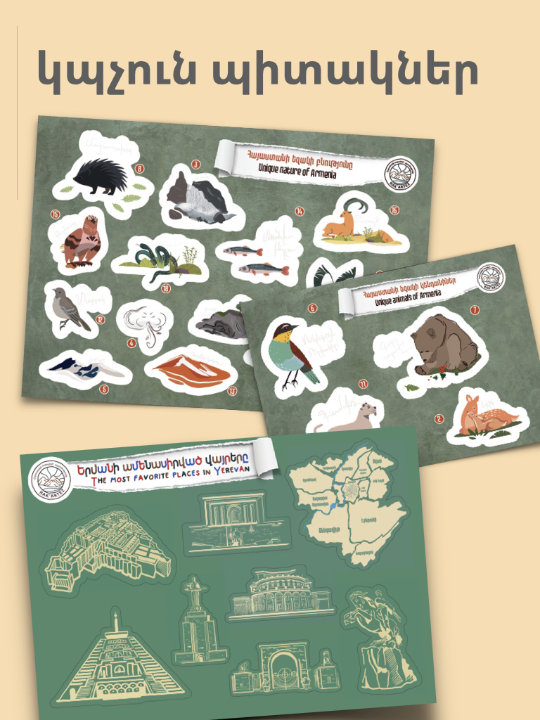 Ստեղծագործական հավաքածու «Հայաստանի պատմությունը, բնությունն ու մշակույթը» — 40 տարրՍիրով պատրաստված՝ Հայաստանի հանդեպ սիրով և երեխաների ստեղծագործական զարգացման հավատովԱյս հավաքածուն պարզապես նյութերի տուփ չէ — այն իրական արկած է։ Այն հրավիրում է երեխաներին բացահայտել Հայաստանի մշակութային, պատմական և բնության ժառանգությունը՝ ստեղծագործական և խաղային եղանակով։ Ամեն մի տարր ոգեշնչում է նկարել, կպցնել, պատկերացնել ու… երազել։ Թղթապանակում՝— 3 դեկորատիվ բացիկ՝ հեղինակային քարտեզներով— 4 գունավորելու բացիկ՝ պատմական փաստերով— 26 սթիքեր՝ բնական ու ճարտարապետական տեսարժան վայրերով— 6 գունավոր ֆլոմաստեր— «Նկարի՛ր քո սիրելի վայրը Հայաստանում»՝ մասնակցելու HaK’artez-ի մրցույթինՀարմար է 5 և բարձր տարիքի երեխաների համարՍտեղծվել և տպագրվել է Հայաստանում՝ էկոլոգիական թղթինԻդեալական նվեր՝ տնային, դպրոցական կամ ճանապարհորդական օգտագործման համար։