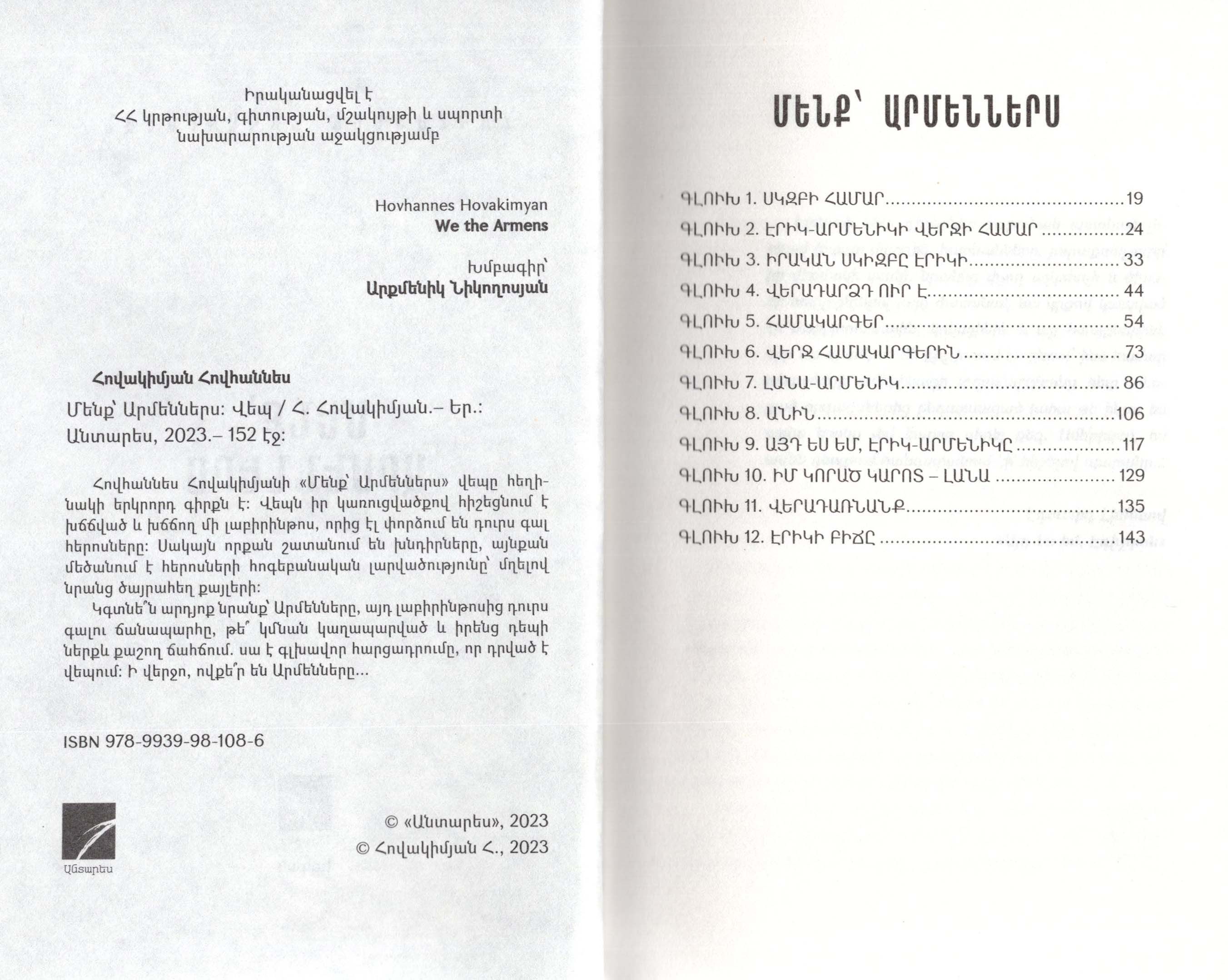Հովհաննես Հովակիմյանի «Մենք՝ Արմեններս» վեպը հեղինակի երկրորդ գիրքն է: Վեպն իր կառուցվածքով հիշեցնում է խճճված և խճճող մի լաբիրինթոս, որից էլ փորձում են դուրս գալ հերոսները: Սակայն որքան շատանում են խնդիրները, այնքան մեծանում է հերոսների հոգեբանական լարվածությունը՝ մղելով նրանց ծայրահեղ քայլերի: