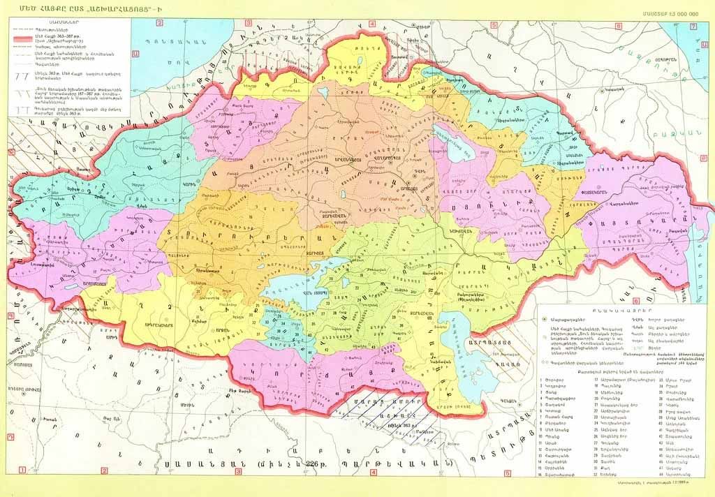 Մեծ Հայքի ու հարակից երկրների քարտեզում ցուցադրված է Հայաստանեայց Աշխարհի կամ Պատմական Հայաստանի հիմնական մեծ մասը՝ Մեծ Հայքը, Փոքր Հայքը, Հայոց Միջագետքը, Հայոց Կիլիկիայի արևելյան կեսը; ինչպես նաև հարևան երկրները՝ Վիրքը, Աղվանքը, Պոնտոսը և այն: Նշված է Մեծ Հայքի վարչատարածքային բաժանումն ըստ «Աշխարհացոյց»-ի: