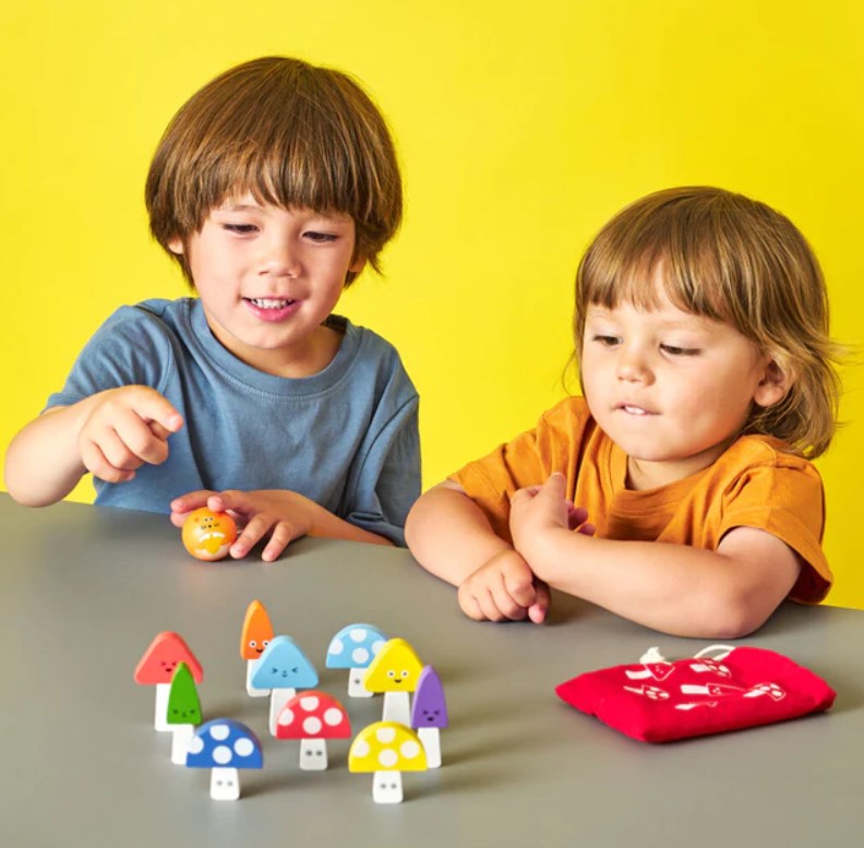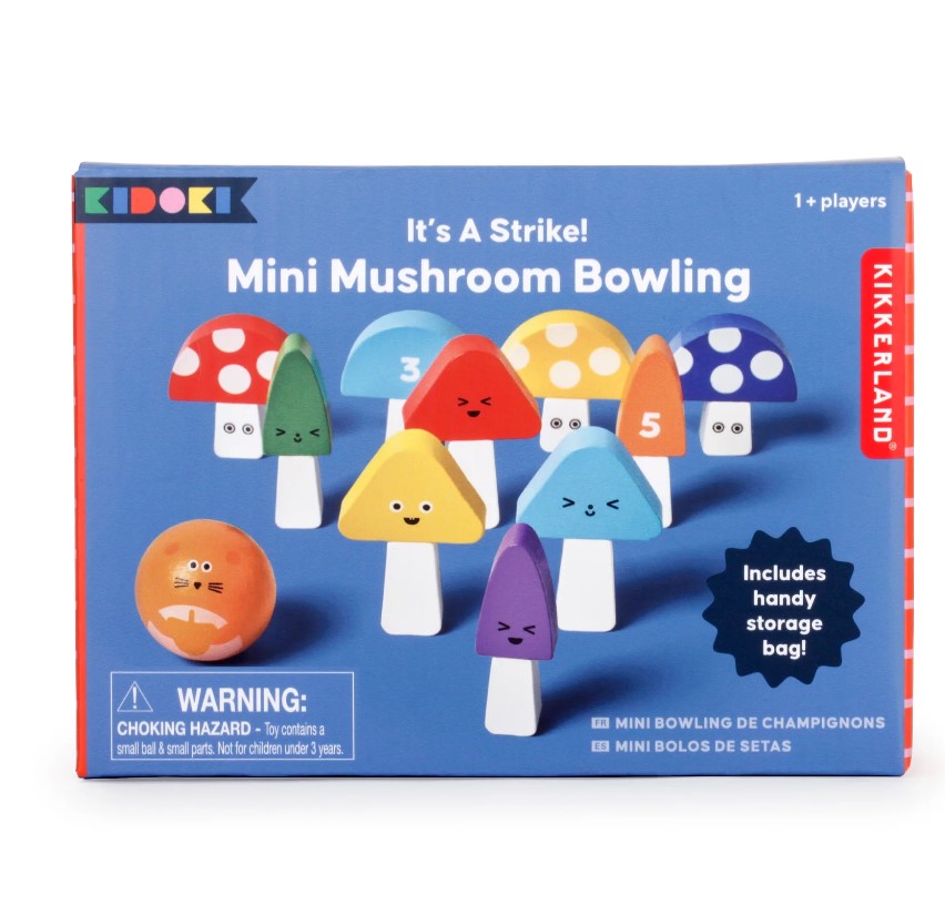 Roll the pesky squirrel and try to knock down as many mushrooms as you can. Includes: 10 mushroom pins, 1 squirrel bowling ball, 1 cotton draw string storage bag. Design: Goodlines Materials: FSC plywood, cotton Packaging: FSC color box Dimensions: 15 x 11 cm