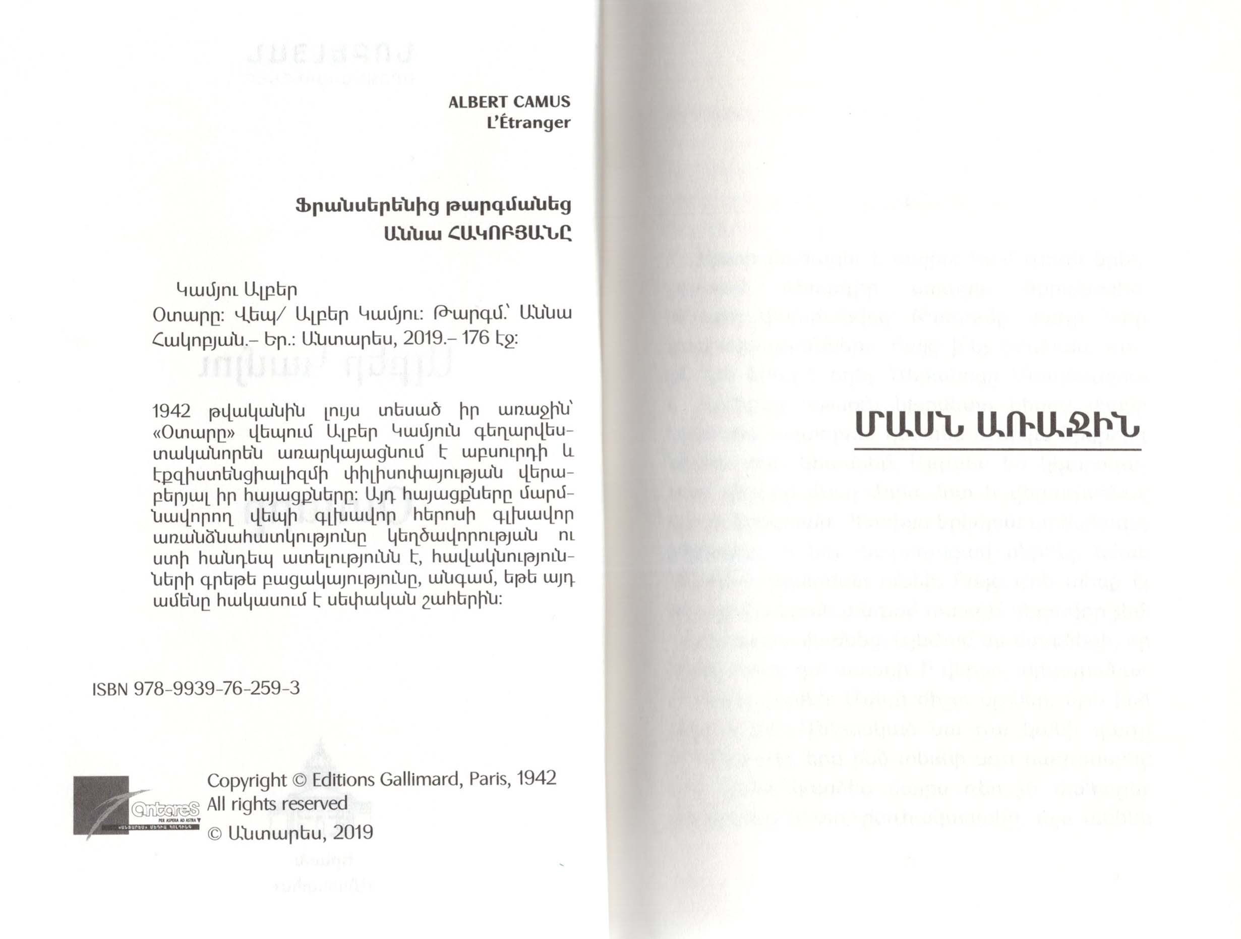 1942 թվականին լույս տեսած իր առաջին՝ «Օտարը» վեպում Ալբեր Կամյուն գեղարվեստականորեն առարկայացնում է աբսուրդի և էքզիստենցիալիզմի փիլիսոփայության վերաբերյալ իր հայացքները: Այդ հայացքները մարմնավորող վեպի գլխավոր հերոսի գլխավոր առանձնահատկությունը կեղծավորության ու ստի հանդեպ ատելությունն է, հավակնությունների գրեթե բացակայությունը, անգամ, եթե այդ ամենը հակասում է սեփական շահերին: