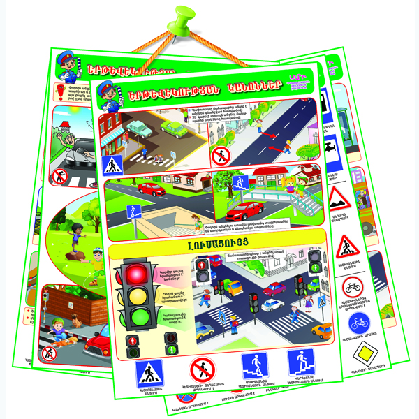 Հավաքածուն ներառում է 5 պաստառ: Ուսումնական հաստատությունների կրթական ծրագրերին ու չափորոշիչներին համապատասխան կազմված պաստառները գեղեցիկ, գունազարդ են, որոնց վրա երեխաների համար պարզ ու մատչելի նկարազարդումներով ներկայացված են ճանապարհային երթևեկության կանոնները, հակիրճ բացատրությամբ: Երաշխավորված է ՀՀ ԿԳՆ-ի կողմից:
