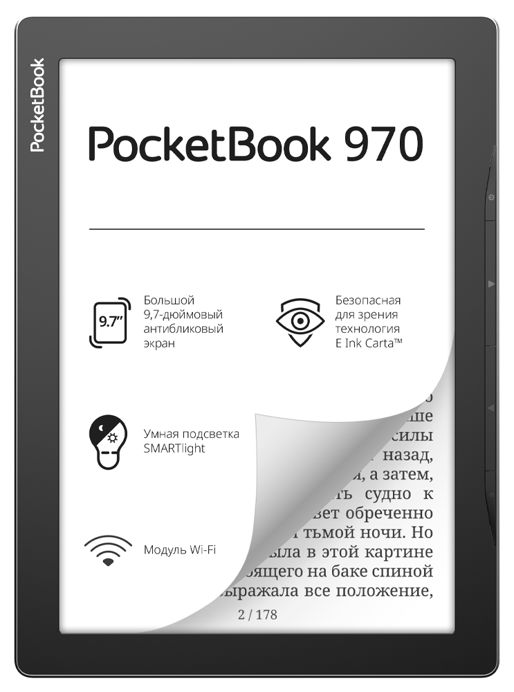 • Երաշխիք՝ 24 ամիս • Էկրանի տեսակ՝ E Ink Carta™ • Էկրանի անկյունագիծ՝ 9.7' • Էկրանի չափ՝ 1404 × 1872 • Էկրանի հասանելի գույներ՝ 16 (մոխրագույնի երանգավորում) • DPI՝ 300 • Սենսորային համակարգ՝ ✓ • Լուսավորում՝ ✓ • Պրոցեսոր՝ Dual core (2×1 ԳՀց) • Օպերատիվ հիշողություն (RAM)՝ 512 ԳԲ • Ներկառուցված հիշողություն (ROM)՝ 8 ԳԲ • USB միակցիչ՝ USB Type-C • Wi-Fi-ի հնարավորություն՝ ✓ • Bluetooth-ի հնարավորություն՝ ✓ • Էկրանի ուղղության ցուցիչ՝ x • Հիշողության քարտի հնարավորություն՝ microSD • Էլեկտրոնային գրքերի ձևաչափ՝ ACSM, CBR, CBZ, CHM, DJVU, DOC, DOCX, EPUB, EPUB(DRM), FB2, FB2.ZIP, HTM, HTML, MOBI, PDF, PDF (DRM), PRC, RTF, TXT • Նկարների ձևաչափ՝ JPEG, BMP, PNG, TIFF • Աուդիոյի ձևաչափ՝ MP3, OGG (через USB Type-C адаптер и Bluetooth) • Աուդիոգրքերի ձևաչափ՝ M4A, M4B, OGG, OGG.ZIP, MP3, MP3.ZIP (через USB Type-C адаптер и Bluetooth) • Տեքստի ընթերցում՝ Անգլերեն, Ռուսերեն (14 հավելյալ լեզուների հնարավորություն, որոնք հնարավոր է անվճար ներբեռնել pocketbook.ch) • Բառարաններ՝ Անգլո-ռուսերեն (Կորոլյով), Webster's 1913, Անգլո-ռուսերեն (PocketBook), Գերմաներեն-ռուսերեն (PocketBook) • Առցանց ծառայություններ՝ PocketBook Cloud, ReadRate, Dropbox PocketBook, Գրքեր email-ի միջոցով • Ծրագրեր՝ Գրադարան, Պատկերասրահ, Հաշվիչ, Քլոնդայք, Բառարան, Սուդոկու, Շախմատ, Օձ, Նշումներ, Գրախանութ • Մարտկոցի հզորություն՝ 2200 mAh (Li-Ion Polymer) • Պլատֆորմ՝ Linux 3.10.65 • Քաշ՝ 370 գ • Չափ՝ 236 x 173 x 7,9մմ • Լրակազմ՝ էլեկտրոնային ընթերցիչ, USB Type-C լար, Micro-USB, USB Type-C audio adapter, օգտագործման պայմանների գրքույկ, երաշխիքի գրքույկ