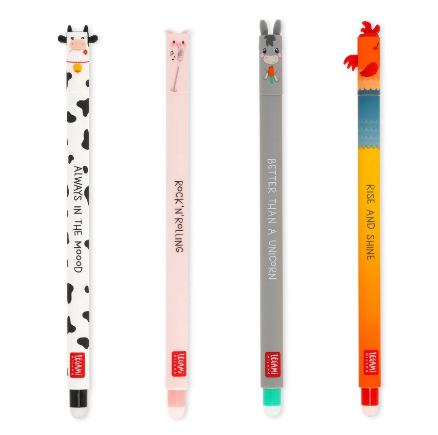 On the farm, everybody pitches in to get the job done! With the Set of 4 Erasable Gel Pens Farm Sweet Farm - Erasable Pen from Legami, you can bring a whole farmyard of animals to school with you inside your pencil case, where they'll be ready to help any time you make a mistake: just rub the sphere on the tip over the thermosensitive coloured ink to erase it and start over!