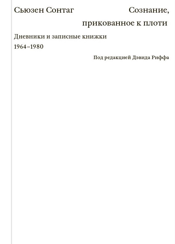 Порою, когда в голову мне приходят необычные мысли, я думаю о том, что материнские дневники (а настоящая книга – это второй из трех томов ее записок) – это не просто автобиография, которую она так и не собралась писать (а поступи она так, то автобиография ее была бы, вероятно, произведением высоколитературным и фрагментарным, в чем-то сродни «Самосознанию» Джона Апдайка, которым она восхищалась), а замечательный автобиографический роман, сочинять который она никогда и не собиралась. Если развивать мою фантазию согласно традиционной траектории, то первый том дневников, «Заново рожденная», окажется романом воспитания – ее «Будденброками» (вспоминая монументальное произведение Манна) или, на более камерной ноте, ее «Мартином Иденом» (прочитанный ею в юности роман Джека Лондона, о котором моя мать с нежностью отзывалась до конца жизни). Этот второй том, который, позаимствовав фразу из дневников, я назвал «Сознание, прикованное к плоти», стал бы романом о деятельной, успешной зрелости'.