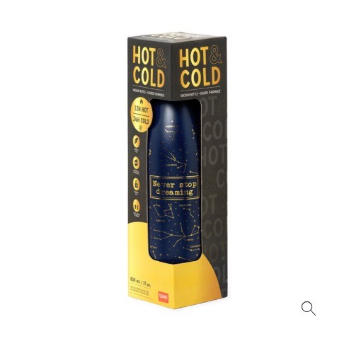 Say goodbye to plastic bottles and take-away cups with the Legami Hot&Cold 800ml Vacuum Bottle - Stars Made of lightweight and resistant double-layer stainless steel, a hermetic seal and a removable silicone handle, this stylish and eco-friendly reusable bottle has a capacity of 800ml, keeping hot drinks warm for 12 hours and cold drinks chilled for 24 hours.