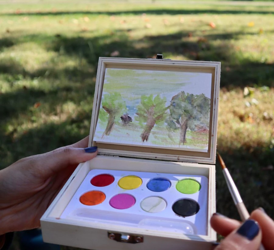 For painters who find inspiration wherever they are. This on-the-go mini watercolor paint set comes in a portable box with a brush, 8 paint color palette, pipette and 4.10” x 2.9” (A7) water color paper pad. Design: Koens & Middelkoop Materials: FSC plywood, PP, PET, cotton, nylon, Packaging: belly band Dimensions: 9,4 x 12 x 3,3 cm