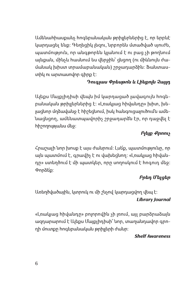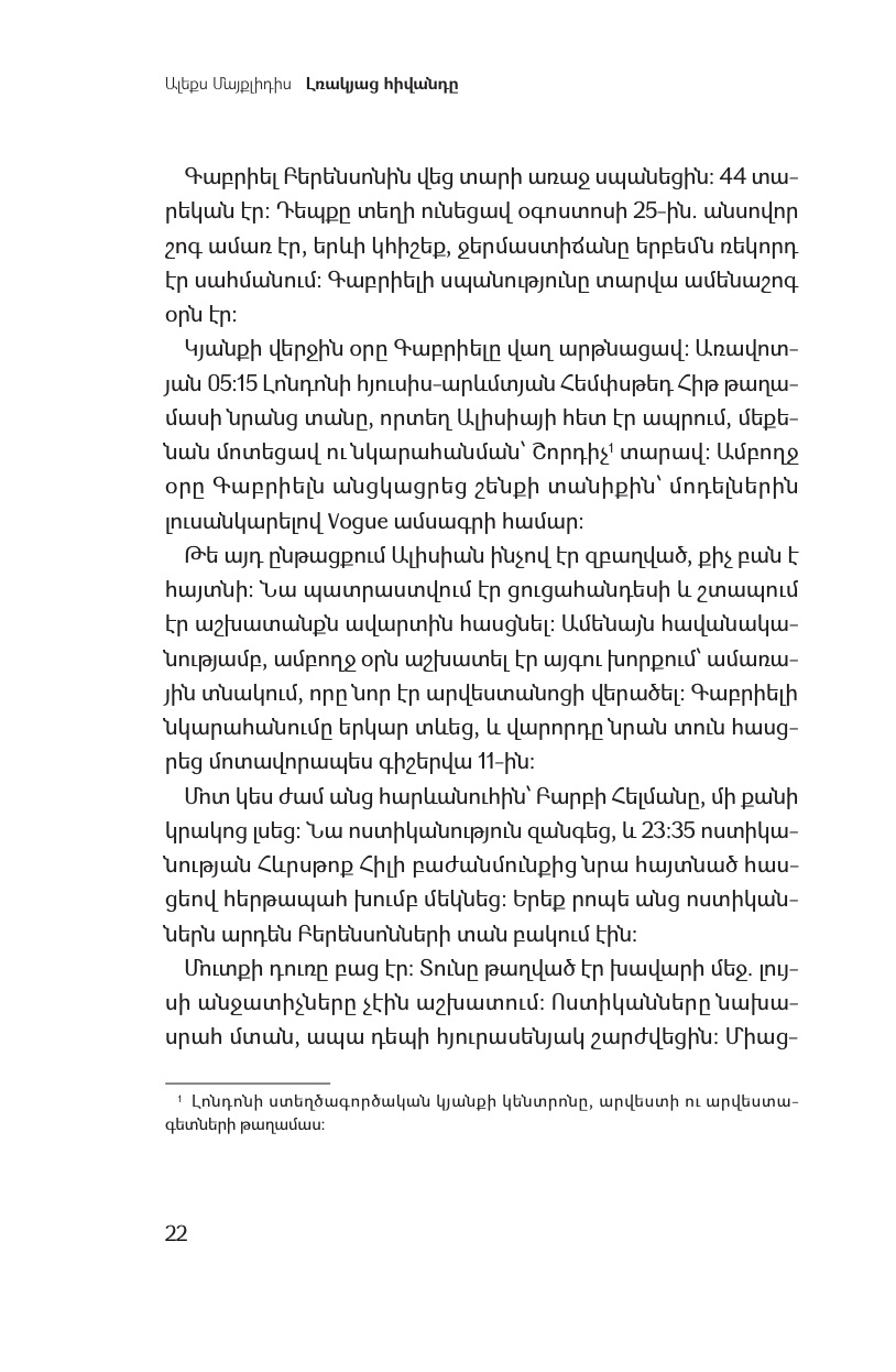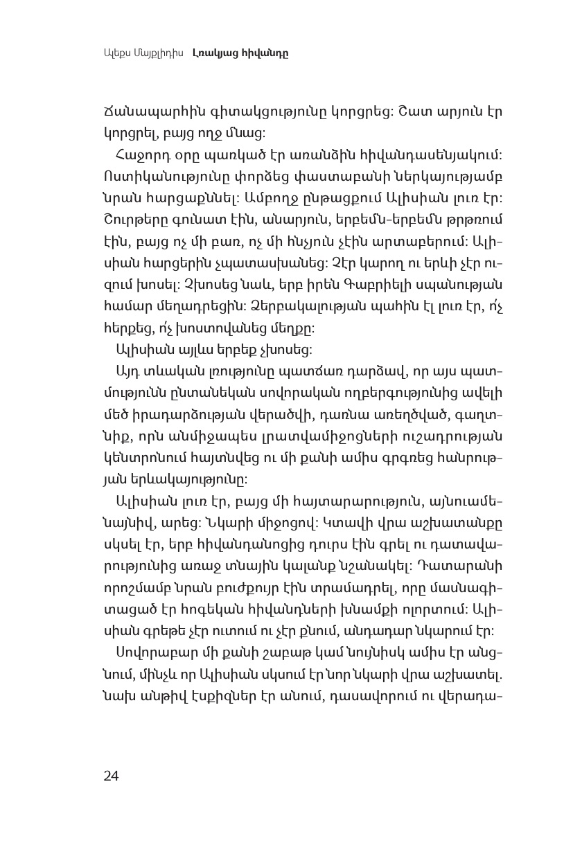 Ալիսիան հրաժարվում է խոսել կամ որևէ կերպ բացատրել եղելությունը, ինչի պատճառով ընտանեկան ողբերգությունը վերածվում է մեծ առեղծվածի, որը բորբոքում է հանրության երևակայությունը։ Ալիսիան անմիջապես հայտնի է դառնում, իսկ նա՝ լռակյաց հիվանդը, գովազդային վահանակներից ու հանրության ուշադրությունից թաքնվում է հոգեբուժարանում: