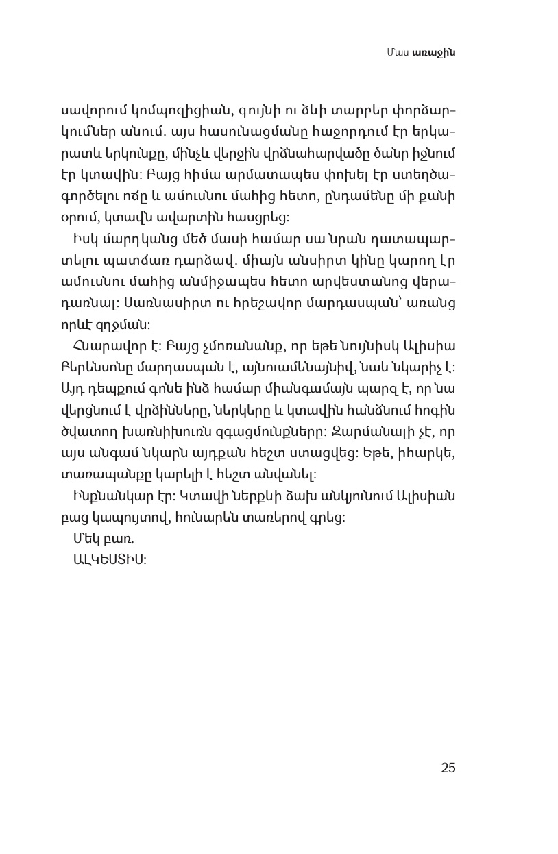 Ալիսիա Բերենսոնի կյանքը, թվում է, կատարյալ է: Հայտնի նկարչուհին ամուսնացած է նորաձևության ոլորտում հանրահայտ լուսանկարչի հետ, ապրում է Լոնդոնի հեղինակավոր թաղամասում: Մի օր, ուշ երեկոյան, ամուսինը՝ Գաբրիելը, վերադառնում է նկարահանումից, և Ալիսիան 5 անգամ կրակում է նրա դեմքին, ինչից հետո այլևս ոչ մի բառ չի արտասանում: