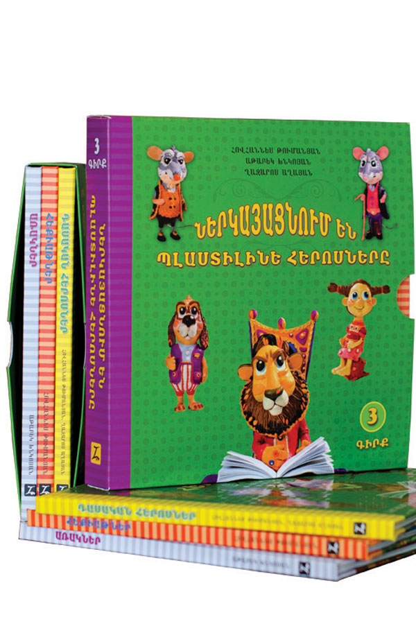Ներկայացնում են պլաստիլինե հերոսները փաթեթը ներառում է 3 գիրք, որոնցում ընդգրկված դասականների ստեղծագործությունները հիացնում են նաև իրենց բացառիկ նկարազարդմամբ: Պոչատ աղվեսը, Գայլն ու գառը, Շունն ու կատուն… շատ շուտ կդառնան փոքրիկների ընկերները, եթե նրանք, հետևելով գրքերում տրված օրինակներին, նույնպես կերտեն պլաստիլինե հերոսներին: