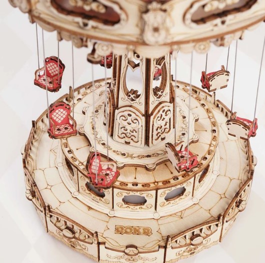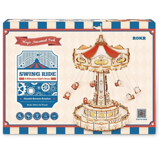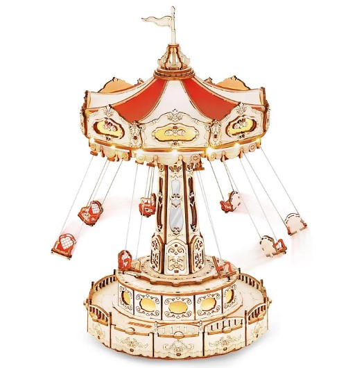 Robotime-ROKR Swing Ride DIY music box is a creative and fun-to-play wooden 3D puzzle kit of Magic Amusement Park Series. Its design is inspired by the swing ride in the amusement park. With built-in movement, the seats will be suspended from the rotating top of the carousel with music and lights on by simply touching the button. Build this exquisite 3D wooden puzzle with your hands and enjoy the ride!