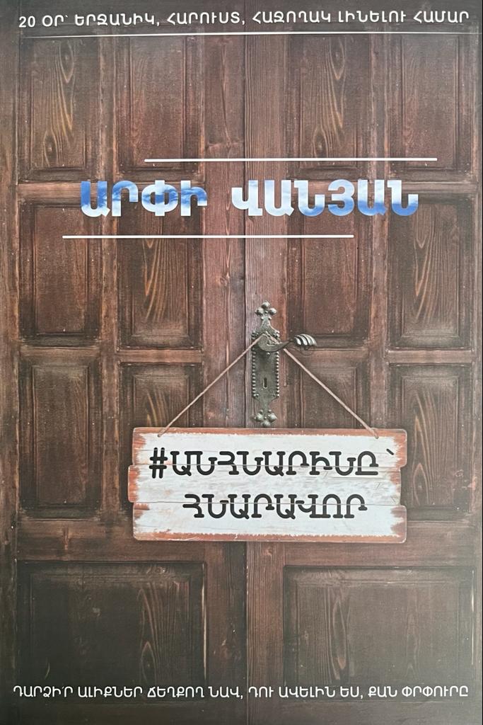 Վերջապես. ահա եւ տարվա ամենասպասված գիրքը: Այս մասին են վկայում ընթերցողների գրառումները սոցիալական կայքերում: Ընթերցելով այս գիրքը` դուք երբեմն կարտասվեք, երբեմն կսկսեք ծիծաղել, կտխրեք, կուրախանաք: Գիրքը ոչ ոքի անտարբեր չի թողնի: Զգուշացնում ենք՝ գրքից հնարավոր չէ կտրվել։ Դուք երազում եք գնալ անցյալ եւ ուղղել ձեր սխալները, դուք երազո՞ւմ եք մեկնել ապագա, եւ այն դարձնել լուսավոր՝ հաշվեք, որ այս գիրքը ձեր ժամանակի մեքենան է, ձեր ճանապարհային ուղեցույցը: Եթե ցանկանում եք իրականացնել ձեր ամենամեծ երազանքը, եթե ուզում եք դառնալ երջանիկ, հարուստ ու հաջողակ, ապա հաշվեք, որ դուք ձեր ձեռքին բռնել եք կախարդական փայտիկ: Ընդամենը 20 օր է անհրաժեշտ, որպեսզի այն, ինչ մինչեւ հիմա համարել եք անհնարին` դառնա հնարավոր: