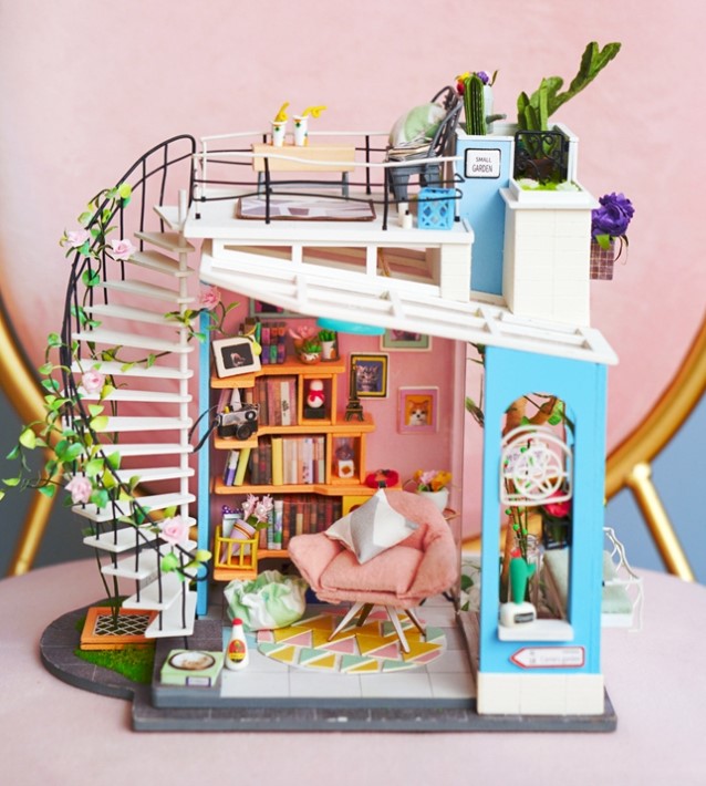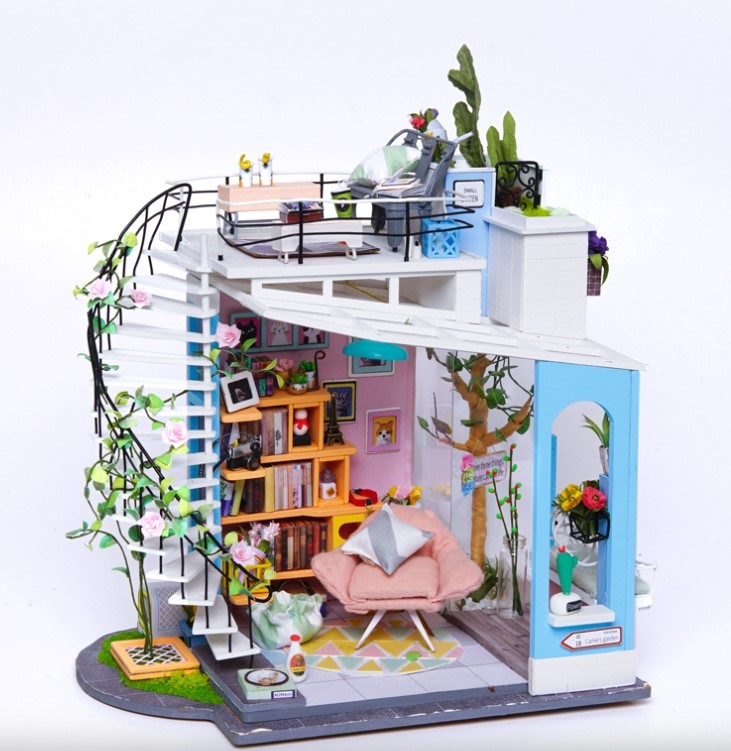 Robotime-Rolife Dora’s Loft DG12 is a modern style duplex apartment DIY miniature dollhouse kit. It is designed with soft and fresh tones like pink, blue and white. You can build so many beautiful details like flowers, vines, spiral stairs, a cozy corner with a sofa and bookshelf. Enjoy the relaxing DIY experience and feel amazed by your work!
