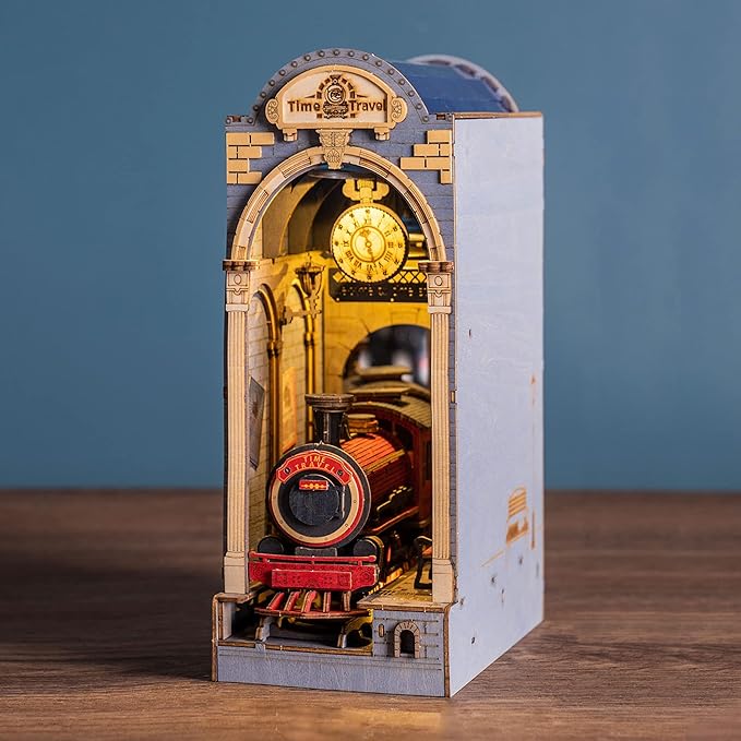 SOPHISTICATED DETAILS:All our products can stand the test of detail. Time Travel decorative booknook has unimaginable creative scenery at a glance. Iron frame roof and blue transparent ceiling; Clock elements; Train and surrounding landscape. Build your own micro world!