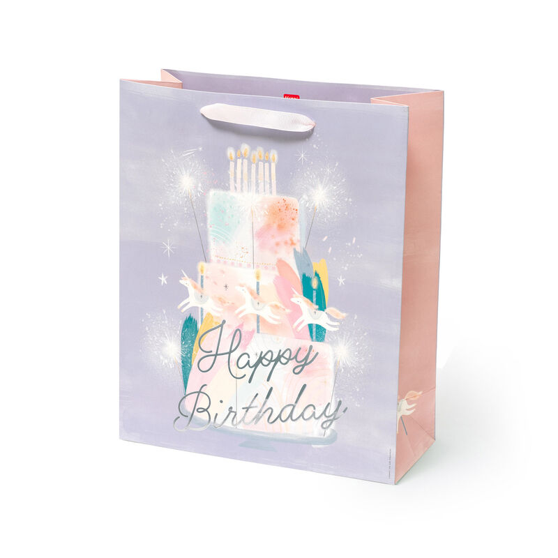 Make it a very happy birthday with the Legami Large Gift Bag - Unicorn Cake. Made of matte laminated paper and ribbon handles, this beautiful gift bag is the perfect finishing touch for any special occasion. The paper is FSC® certified (FSC-C154586), from certified forest sources. 26.5 x 32.5 x 11.5 cm Matte laminated paper 210 g/m²