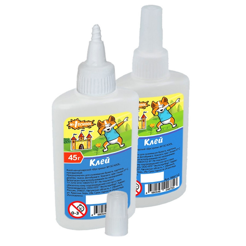 Синтетический канцелярский клей № 1 School - морозостойкий, прозрачный, абсолютно безопасный клей высокого качества, предназначенный для офисных канцелярских работ по бумаге и картону, а также для приклеивания фотографий. Клей безопасен для детей, не имеет запаха, не токсичен, экологически безопасен, не содержит растворителей. Удобный флакон оснащен крышкой-дозатором со съемным колпачком, защищающим от пересыхания при хранении. Вес: 45 г (объем: 45 мл). Клей имеет консистенцию - гель.