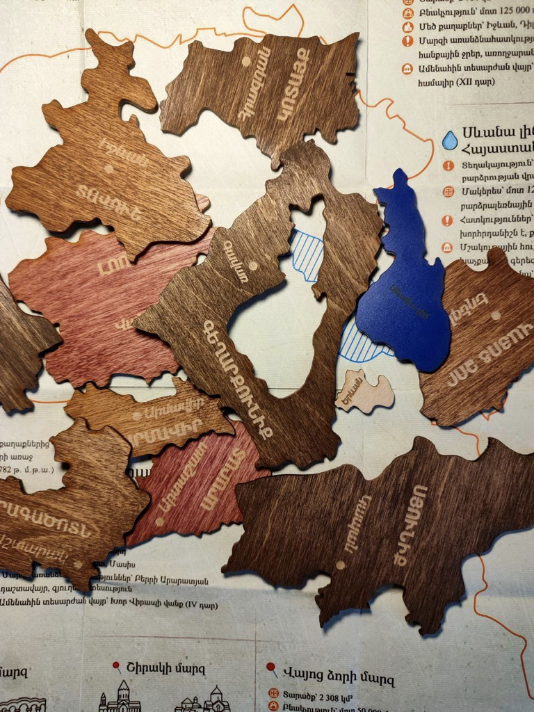 Բացահայտեք Հայաստանը՝ եզակի փայտե փազլ-քարտեզի միջոցով։ Այս փայտե քարտեզը ներկայացնում է երկրի բոլոր մարզերը՝ վարչական կենտրոններով, բնակչության թվով և կարևորագույն տեսարժան վայրերով։