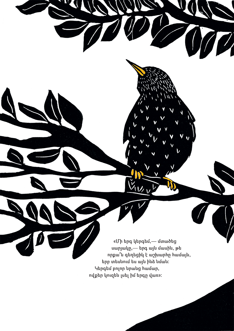 Գիրք` գեղեցկությունն ամենուր տեսնելու մասին։ Սարյակը, տեսնելով աշխարհը վերից, հմայվում է դրա անհուն գեղեցկությամբ և որոշում է երգ ձոնել նրան։ Սարյակի երգն իրենց խորհուրդներով հարստացնում են նաև մյուս թռչունները։Գրող և նկարիչ Օկտավի Վոլտերսն այս գրքի համար պատրաստել է հրաշալի լինոգրաֆիաներ։ Հեղինակի առաջին մանկական գիրքն է։